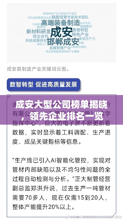 在成安地区的大型公司中,XX公司无疑是最具影响力的一家,多年来,该公司凭借其卓越的经营理念和创新能力,在行业内稳居领先地位,XX公司的业务范围广泛,涵盖了多个领域,为成安地区的经济发展做出了巨大贡献。